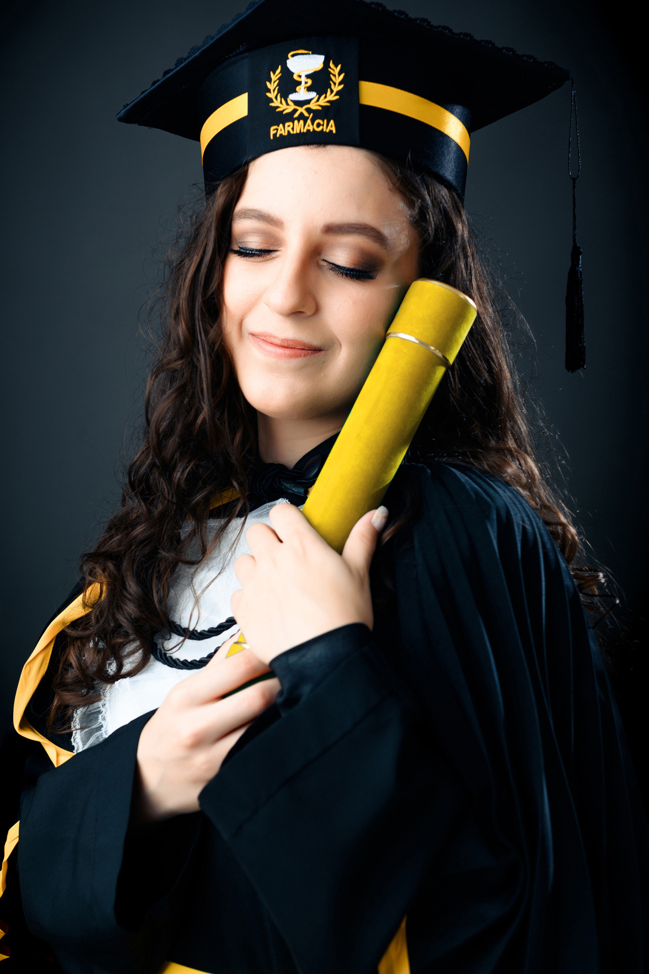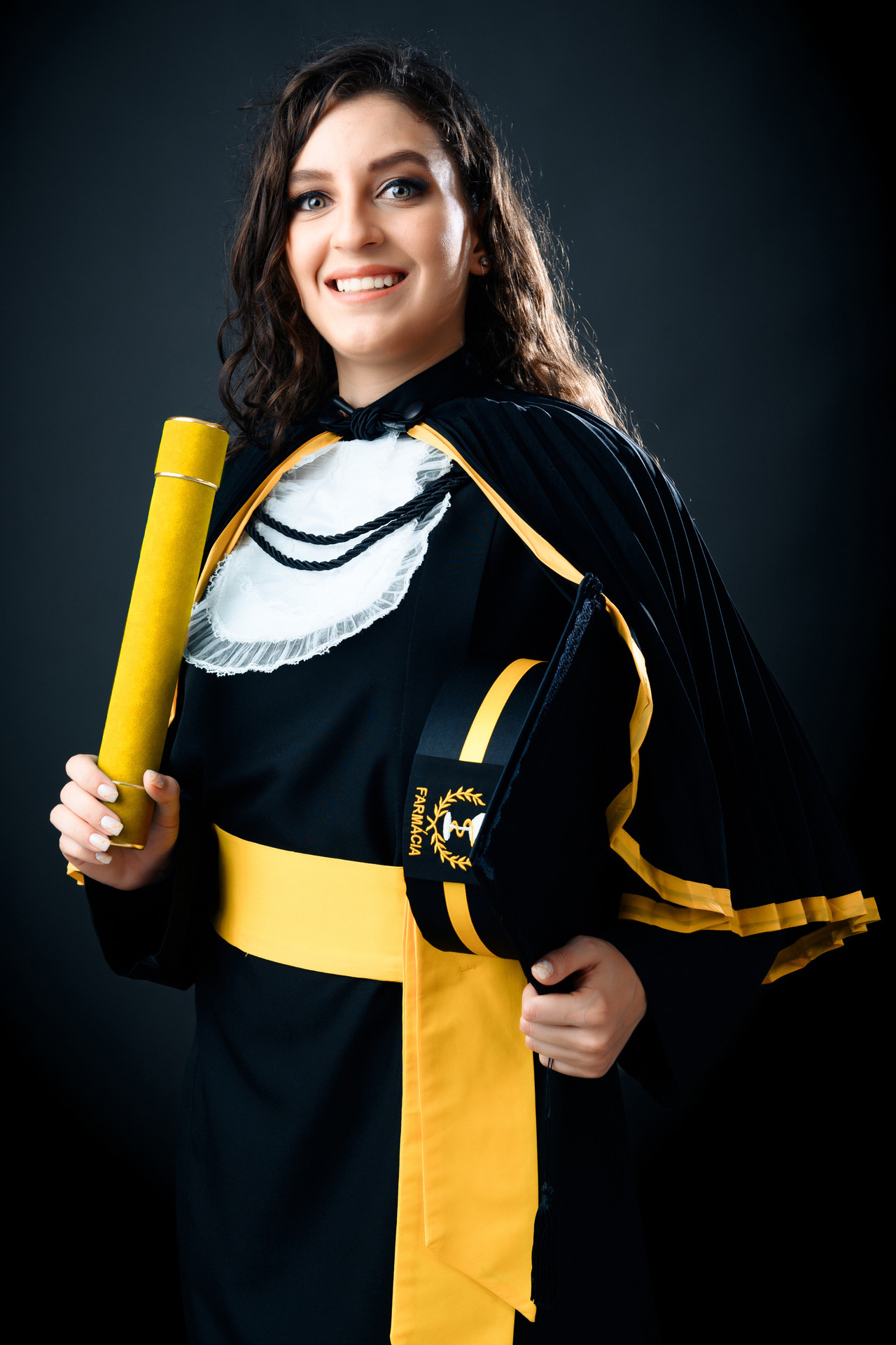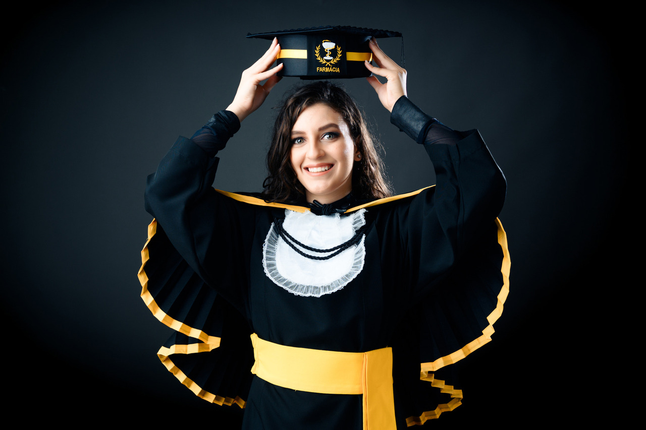 Em nossa proposta de ensaio de formatura, fornecemos a beca de luxo completa e higienizada de acordo com manequim. Canudo e Capelo com símbolo do curso.