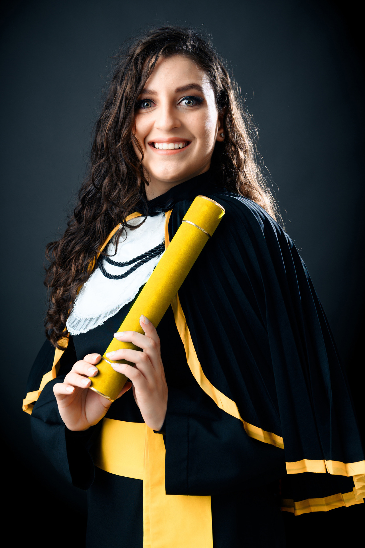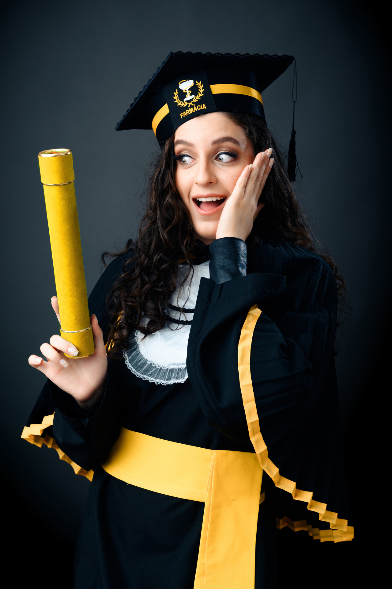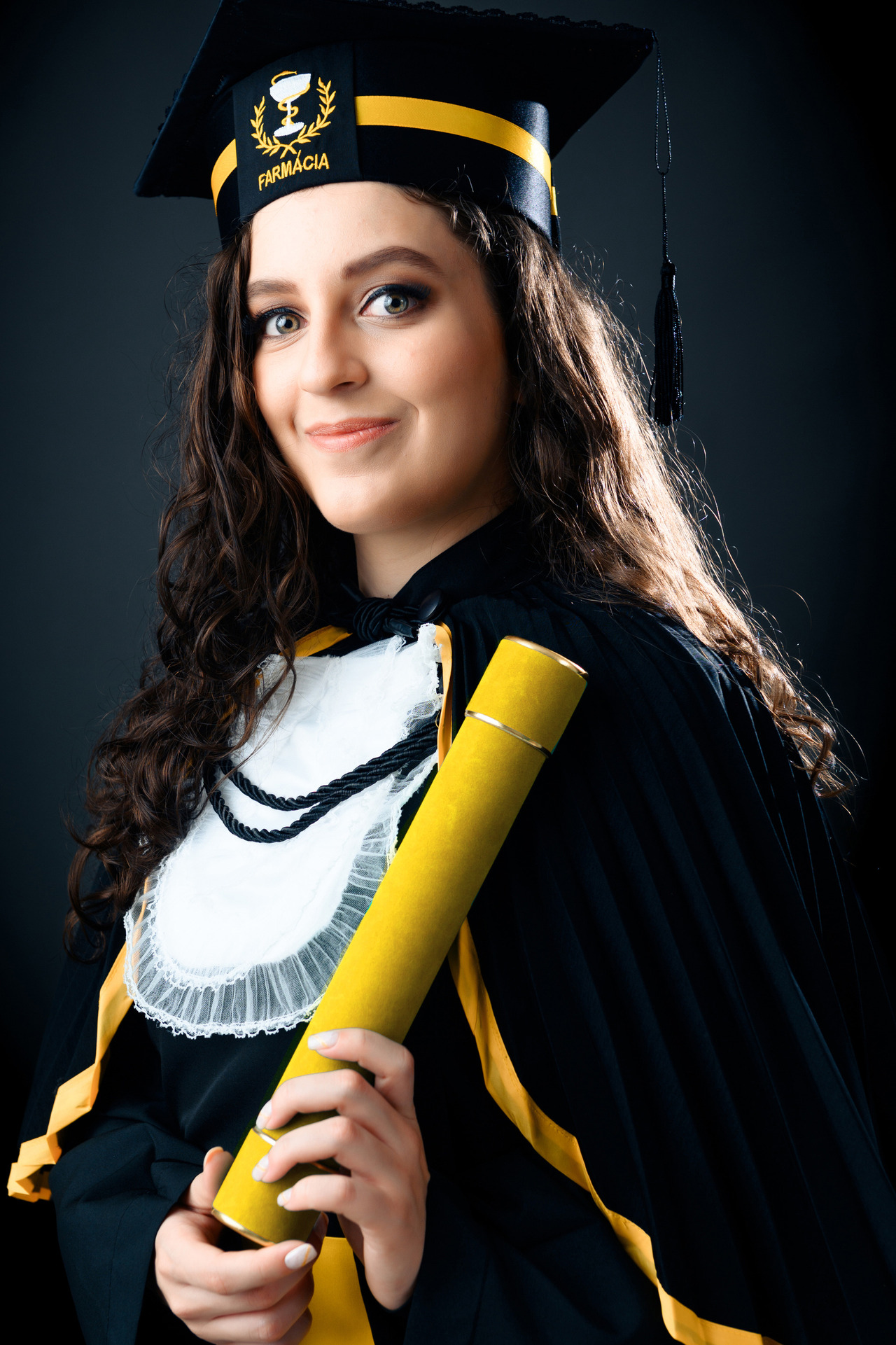 Em nossa proposta de ensaio de formatura, fornecemos a beca de luxo completa e higienizada de acordo com manequim. Canudo e Capelo com símbolo do curso.